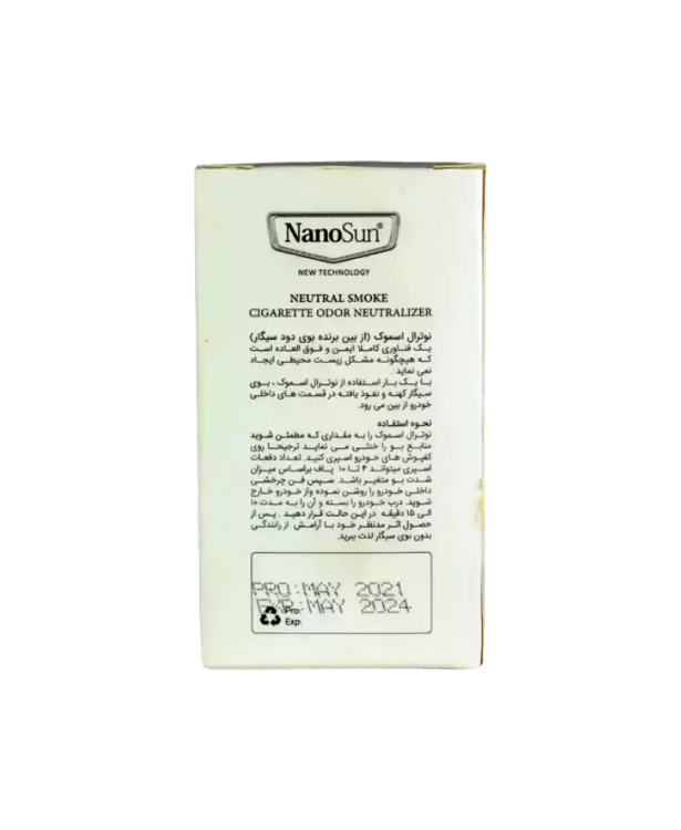 اسپری بوگیر سیگار محصولی از دسته نانوسان ها است که تحت لیسانس آلمان در ایران تولید می شود. ترکیبات اصلی بوگیر سیگار نانو برگرفته از روغن ها و عصاره درختان و گیاهان است که عطر مطبوع و ملایم کاج را دارد.